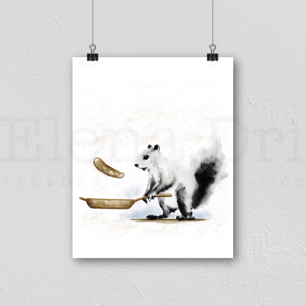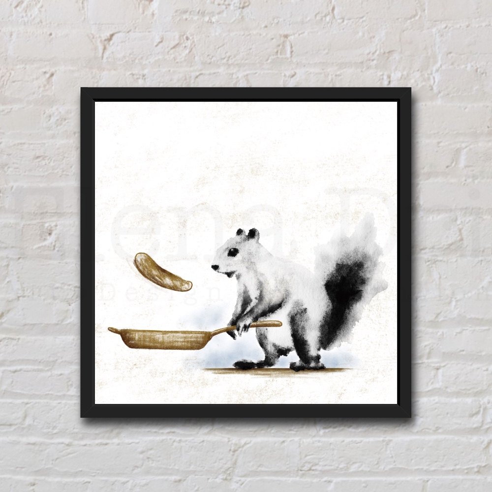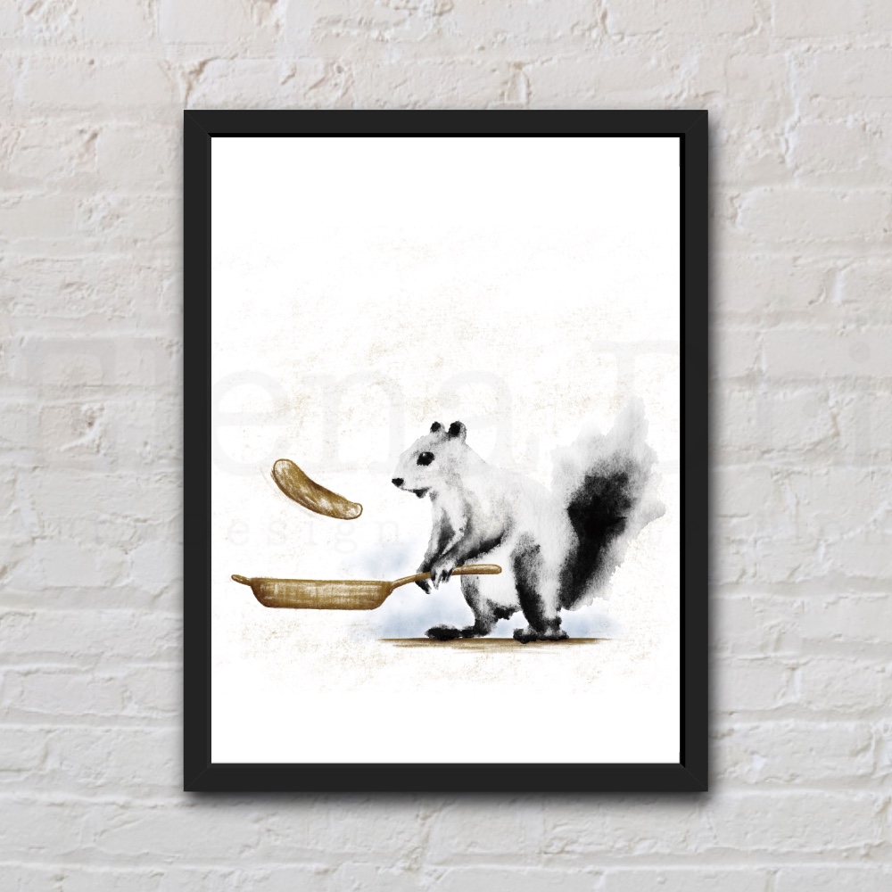 Add some fun to your home or someone else’s with this black and white watercolor of a squirrel making crepes.