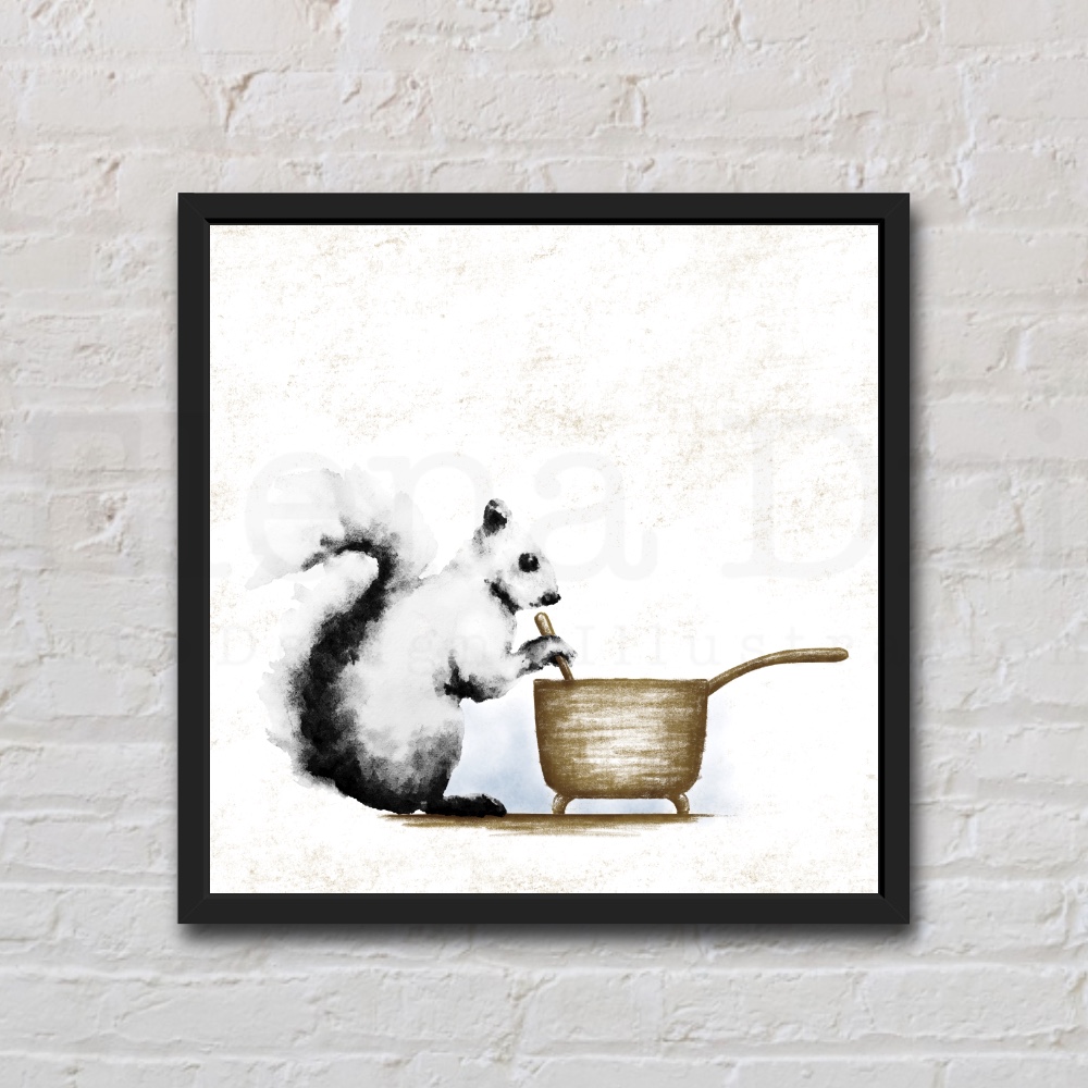 Add some fun to your home or someone else’s with this black and white watercolor of a squirrel with a saucepan.