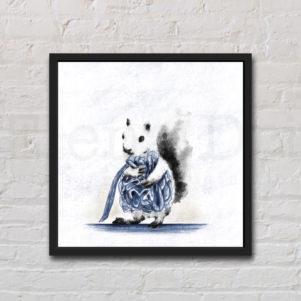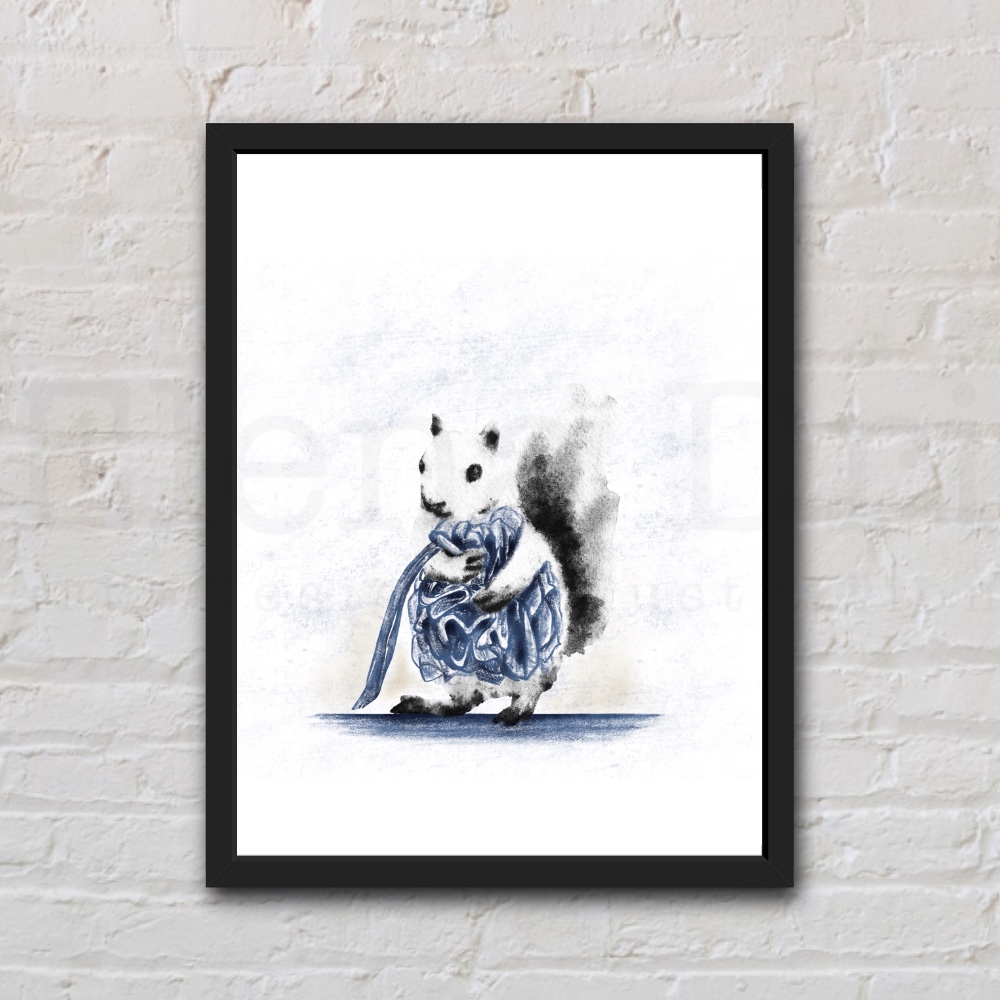 Add some fun to your home or someone else’s with this black and white watercolor of a squirrel with a shower pouf.